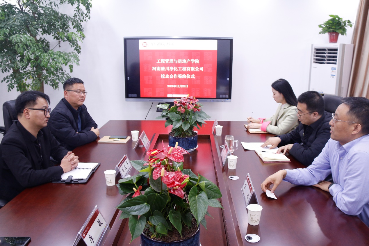 12月28日上午,冰球官网与河南盛川净化工程有限公司在建树楼C座539会议室举行校企合作签约仪式。河南盛川净化工程有限公司周建平、李敏,尉氏县科技局副局长李杰,冰球官网院长张扬、副院长曹飞、BIM技术骨干教师季强、分管就业辅导员韩冬梅出席此次签约仪式。