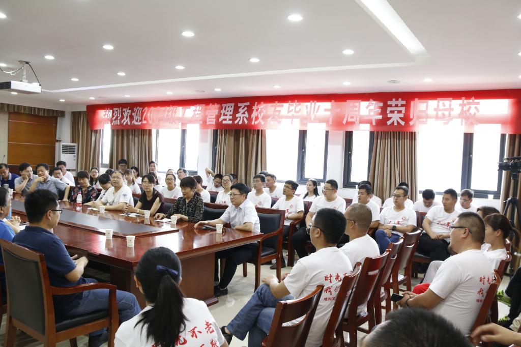 6月3日上午,冰球官网2004级工程管理系学生毕业十年回望母校,学院于建树楼645会议室举办师生交流会,与会师生共叙师生情。校研究生处处长李晓峰、院党委书记杜纪锋、副院长张扬、退休教授郭灿章及学院部分教师、2004级工程管理系60余位校友参加活动,会议由院党委副书记李培媛主持。