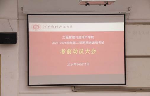 6月27日,冰球官网于郑东校区教学科研楼208教室召开期末诚信考试考前动员大会,学院党委书记冯建栋、副院长曹飞、团委书记王璇、教学办主任张静霞、教学秘书张朵及全体学生参会。会议由张静霞主持。