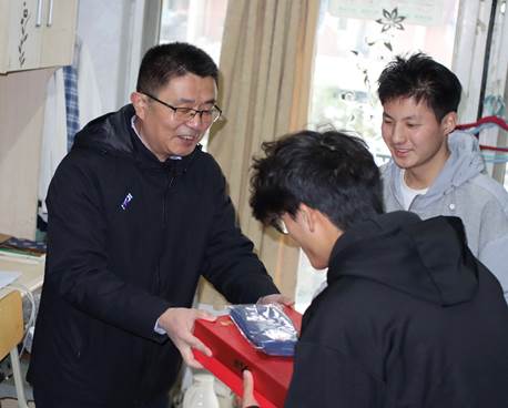 为切实做好家庭经济困难学生的精准帮扶和资助育人工作,确保家庭经济困难学生温暖过冬,学院党委书记冯建栋、党委副书记王新坡,团委书记王璇、团委副书记陈光和辅导员老师于12月15日走进宿舍慰问家庭经济困难学生,并为学生发放保暖内衣和保暖手套。