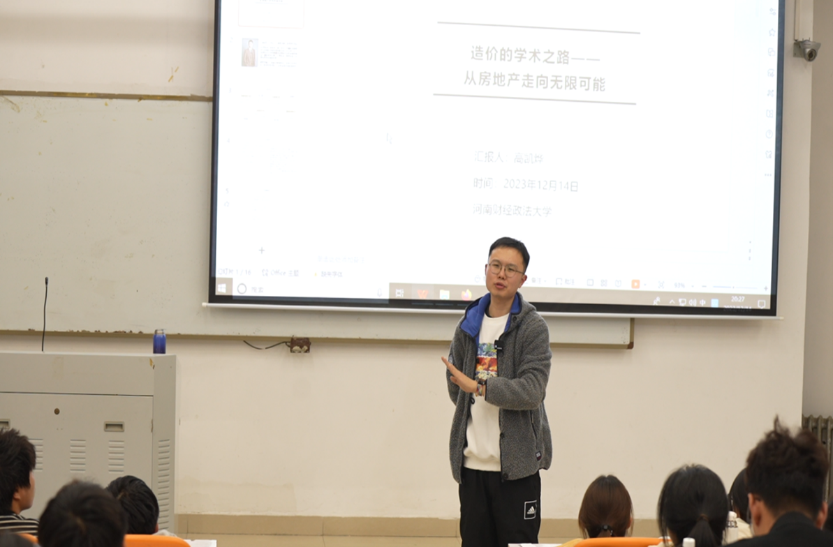 课堂上,高凯烨以“造价的学术之路—从房地产走向无限可能”为题,主要从其教育经历、工作经历、研究领域、研究成果以及近5年代表作五个方面开展本次课程讲座。高凯烨曾就读于冰球官网2009级工程造价专业,他以自己的教育经历为引,讲述了硕士阶段、博士阶段、公派留学及博士后阶段自己的规划与选择、困难与挑战、努力与成长,他用自己一路的学术经历阐述了造价的学术之路有无限的可能。最后,他对学生关心的工程管理类专业就业、考研等问题给出了自己的见解和建议。