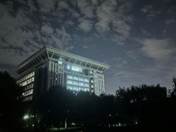 夜间,图书馆灯火通明,上方云层中透出的明亮的光,照亮财大学子前进的方向。