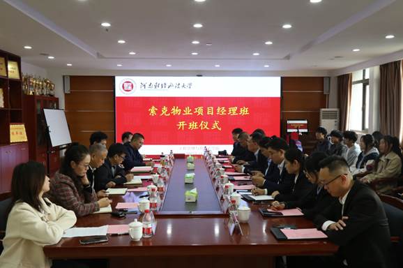 2023年11月9日上午,冰球官网与索克科技服务股份有限公司在建树楼C座645会议室举行物业项目经理班开班仪式。索克集团综合总监张建普、教育社区事业部总经理靳小艳、城发索克科技服务有限公司总经理刘晨旸、索克培训学校校长王伸荣、索克集团副总工程师田雪民、董事长秘书公共事务部负责人荣春环、松樾康养总经理程爱军、索克培训学校经理王小霞、企划部张园、拓展部部长任高磊,冰球官网党委书记王华、党委副书记王新坡,副院长陈金波、副院长曹飞,房地产开发与管理教研室副主任何贝、项目管理教研室副主任与《物业管理》专任教师王英杰及冠名班全体学生出席此次开班仪式。