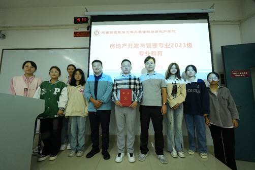 李博博士和孔纯友先生均是知名房地产营销实战专家,在房地产行业深耕多年,拥有丰富的实践经验。活动开始,陈卫华主任首先为孔纯友先生颁发了校外导师聘书,并对孔总长期以来对房产系的支持表示感谢。两位专家先后做了题为《相逢青春里,未来皆可期》和《房地产业概况和就业方向》的讲座,针对新生在什么是房地产、房地产专业要学什么、将来能做什么工作等方面的种种困惑,结合自己的从业经历,从房地产业在国民经济中的重要地位、房地产开发的基本流程、房地产业的就业岗位、房地产业的未来发展等方面做了详细介绍,最后还进行了互动交流,解答了一些具体问题。李博博士祝贺同学们考取“河南地产黄埔军校”,勉励大家一定要抓住新一轮地产周期起点的良机,不负韶华;孔纯友先生希望大家做一个爱读书的人,从书中汲取无穷智慧。