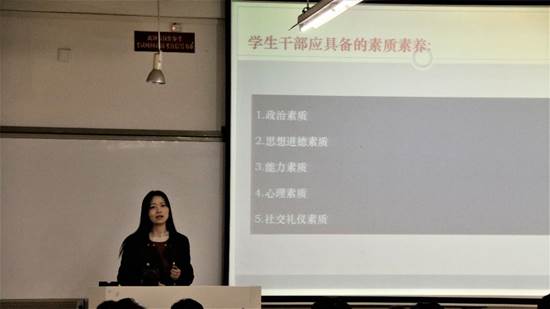 韩冬梅以“学生干部的素质素养”为主题,从学生干部的政治素质、思想道德素质、能力素质、心理素质、社交礼仪素质五个方面进行培训。韩冬梅首先肯定了学生干部的辛苦付出。其次,她强调学生干部要坚定政治立场,承担起相应责任,做到在其位,任其职,尽其责。最后,她希望学生干部提高抗压能力,掌握基本社交礼仪,发挥模范带头作用,展现学院良好风貌。