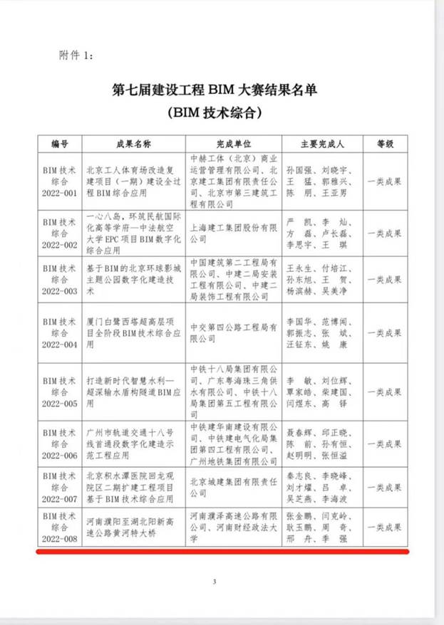第七届建设工程BIM大赛由中国建筑业协会主办,参赛成果须经各省、自治区、直辖市建筑业协会(联合会、施工行业协会),有关行业建设协会、国务院国资委管理的有关建筑业企业以及中国建筑业协会有关分支机构推荐才有资格参评。阳新高速黄河特大桥项目自建设以来,坚持高质量建设,我校冰球突破豪华版官方网站师生团队(季强、李旖婷、徐珂、赵倩倩、罗闯、迟田钰、相卓、王奕斐、吴艺晨、王人杰、刘家宁、徐净、覃颖、李瑞娜、李歌、郑含钰、王皓波、王思文)和濮泽、金途公司的合作下,荣获第八届中国国际“互联网+”大学生创新创业大赛河南赛区二等奖、2022年(第七届)大学生计算机设计大赛河南省一等奖、第五届建设工程“中原杯”BIM大赛一等奖、河南省工程建设协会第四届“匠心杯”BIM大赛一等奖。中国图学学会“龙图杯”全国BIM大赛优秀奖、2022年(第15届)中国大学生计算机设计大赛国家三等奖、中国施工企业管理协会第三届工程建设行业BIM大赛三等奖、第二届“新基建杯”中国智能建造及BIM应用大赛国家二等奖、第七届建设工程BIM大赛一等奖、广联达第八届全国高校BIM毕业设计创新大赛国家一等奖、2022年“鲁班杯”BIM设计大赛两项国家一等奖、第三届“品茗杯”全国高校BIM应用毕业设计大赛国家特等奖。以上奖项为BIM技术高质量发展奠定坚实基础,助力BIM技术与智慧建造河南省工程实验室和冰球突破豪华版官方网站品质工程高质量发展研究中心实现更大突破,进一步深化校企合作模式。