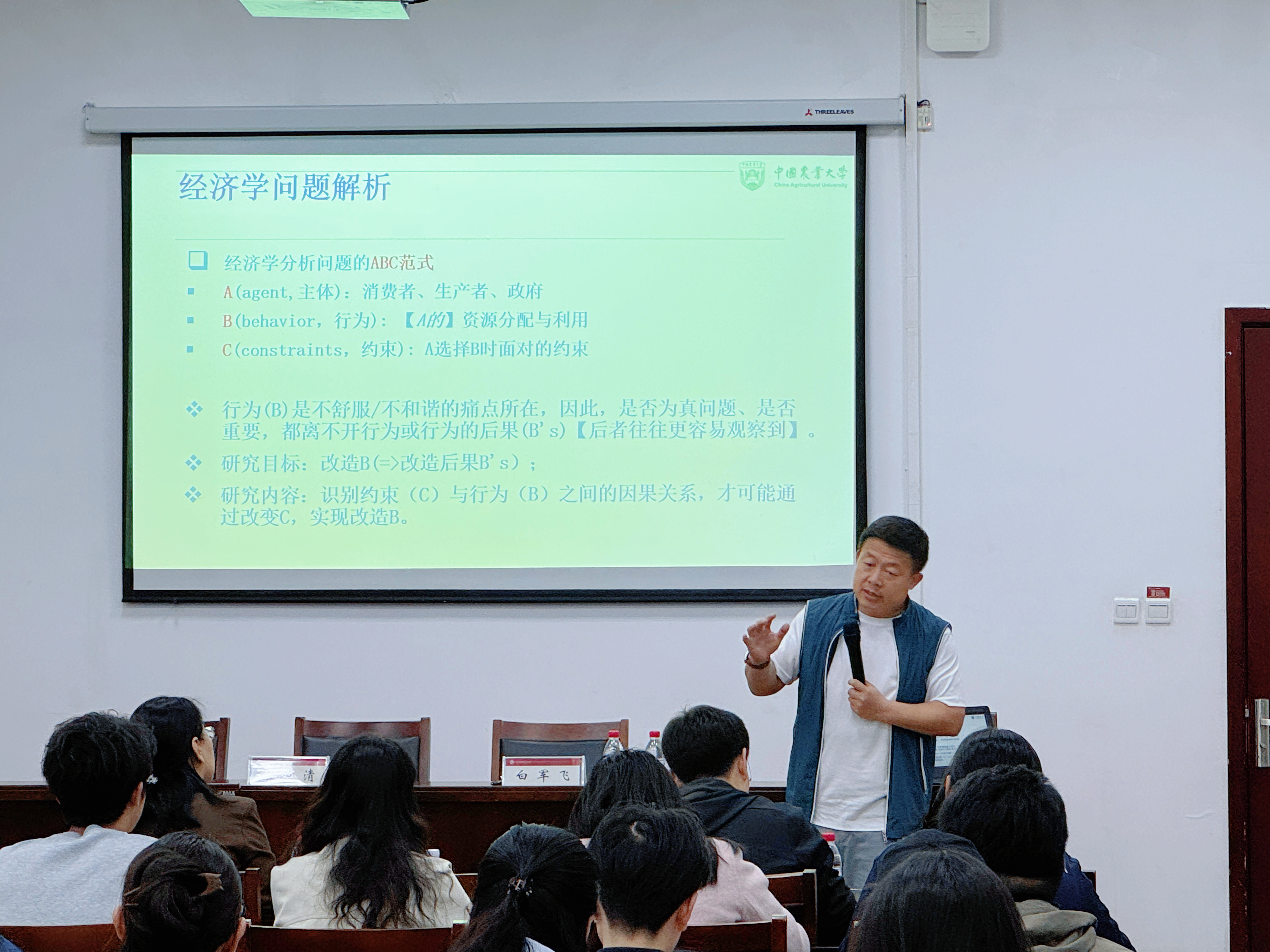 张改清对白军飞教授的到来表示诚挚欢迎。本次论坛上,白军飞教授以“友好化信息传递与行为优化:以农药标签为例”为主题展开精彩演讲。他首先对经济学一般性研究范式进行了概括讲解,并以农药标签研究作为案例,生动再现了经济学研究范式的实际操作,并深入剖析友好化信息传递在农业生产中的重要性,为在场师生带来了一场知识盛宴。